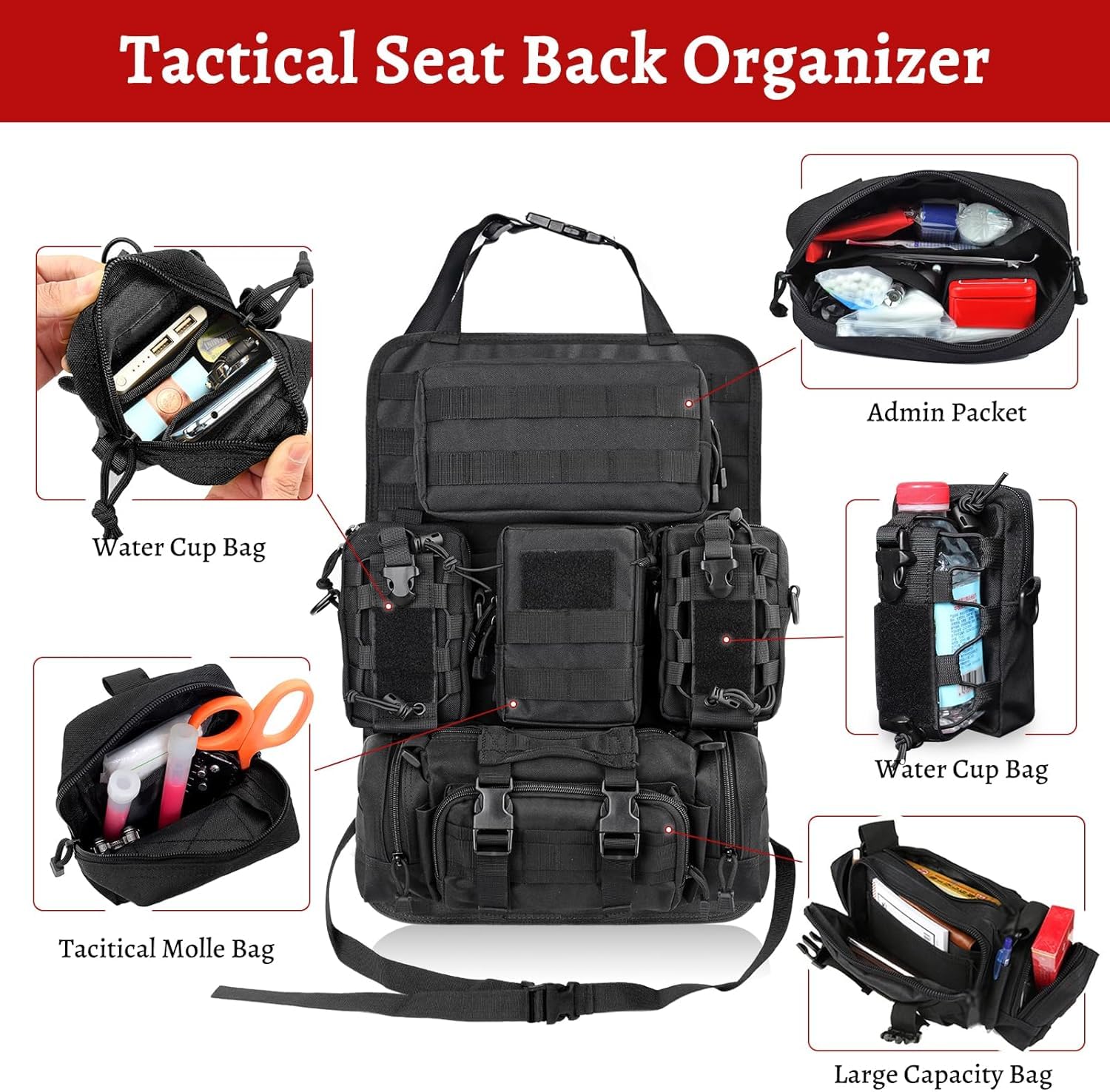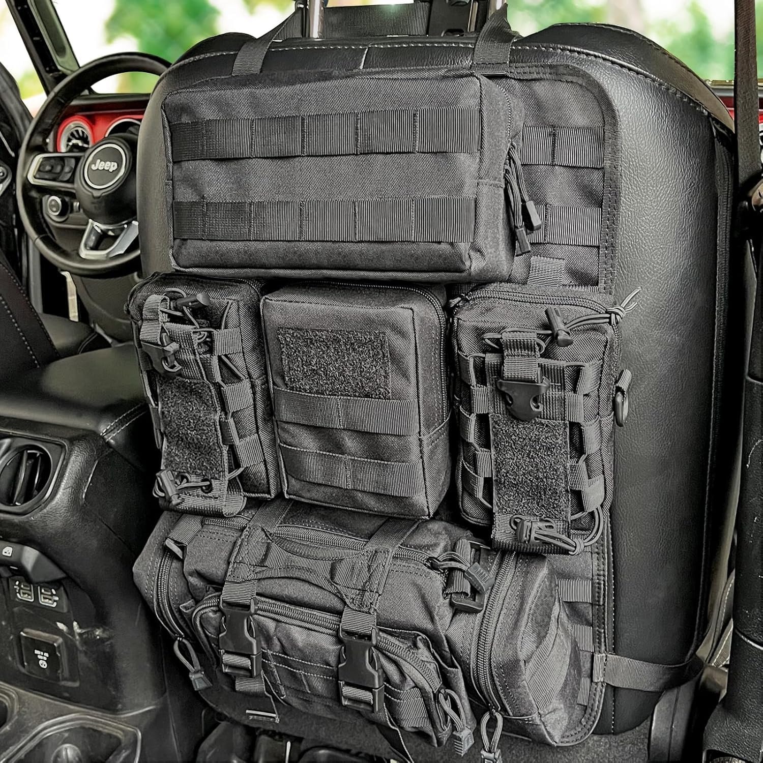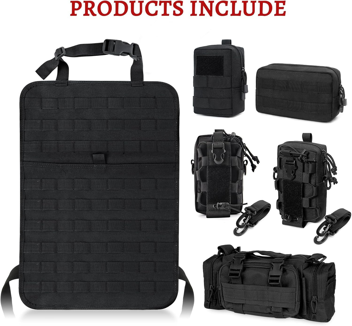 タクティカルカーシートバックオーガナイザー、ユニバーサルカーシートバックカバー、5 つの Molle ポーチ付き、すべての車両に適合 (調節可能なウォーターカップバッグ 2 つ)