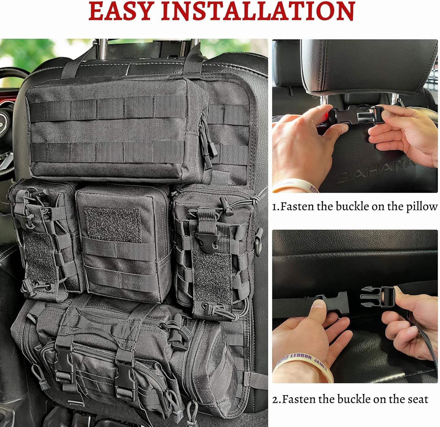 - 取り付け: 調節可能なストラップで、ヘッドレストの周りやシートバックとベースの間の底に簡単にフィットするように調整できます。各 Molle バッグはベルクロテープとバックルで設計されており、各ポーチは柔軟に追加または取り外しできます。