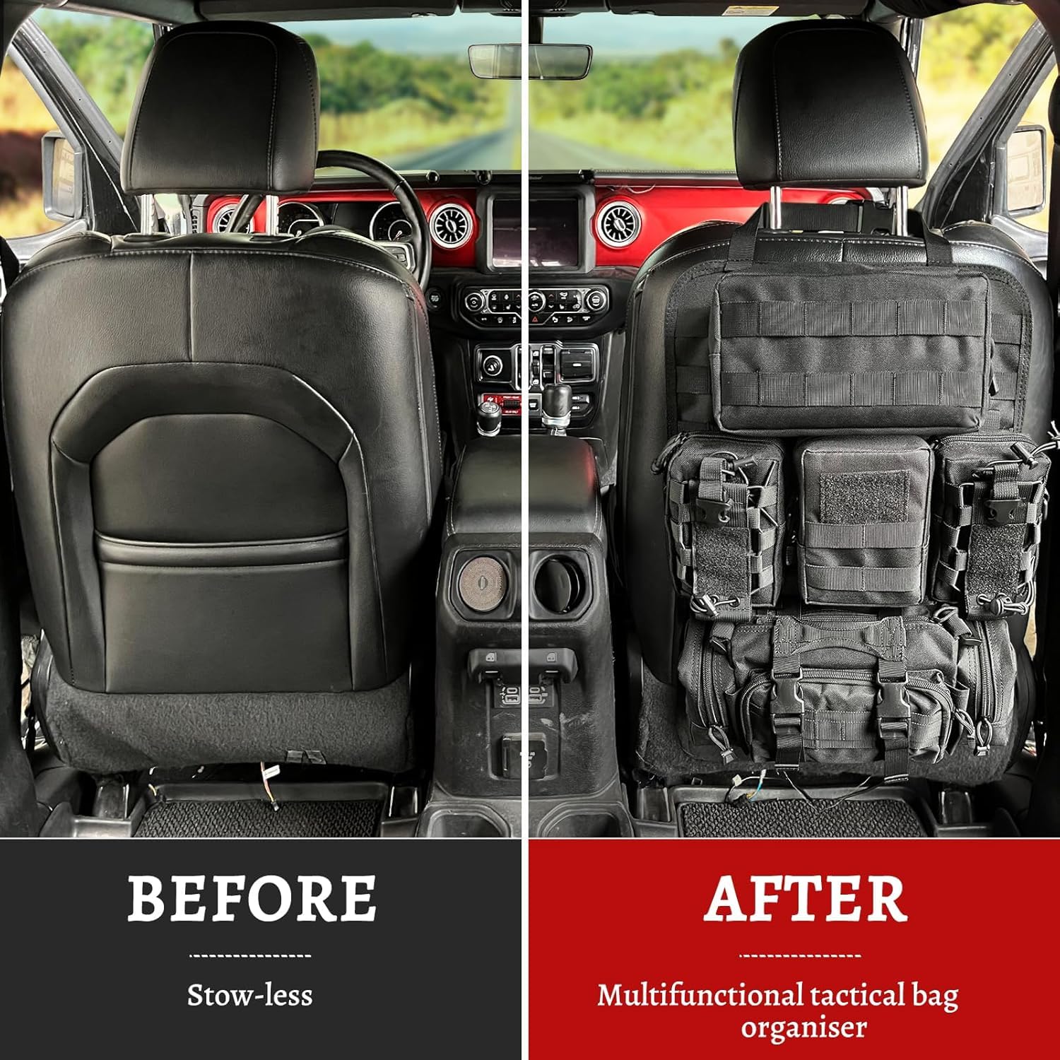 - 優れた収納ソリューション: 車に優れた収納ソリューションを提供します。収納を拡張することで、さまざまなサイズのアイテムの収納問題を解決できます。救急用品、タクティカル ギア、電話、iPad、財布、地図、懐中電灯、本、その他のアイテムを収納できます。後部座席を整理し、スペースを節約できます。